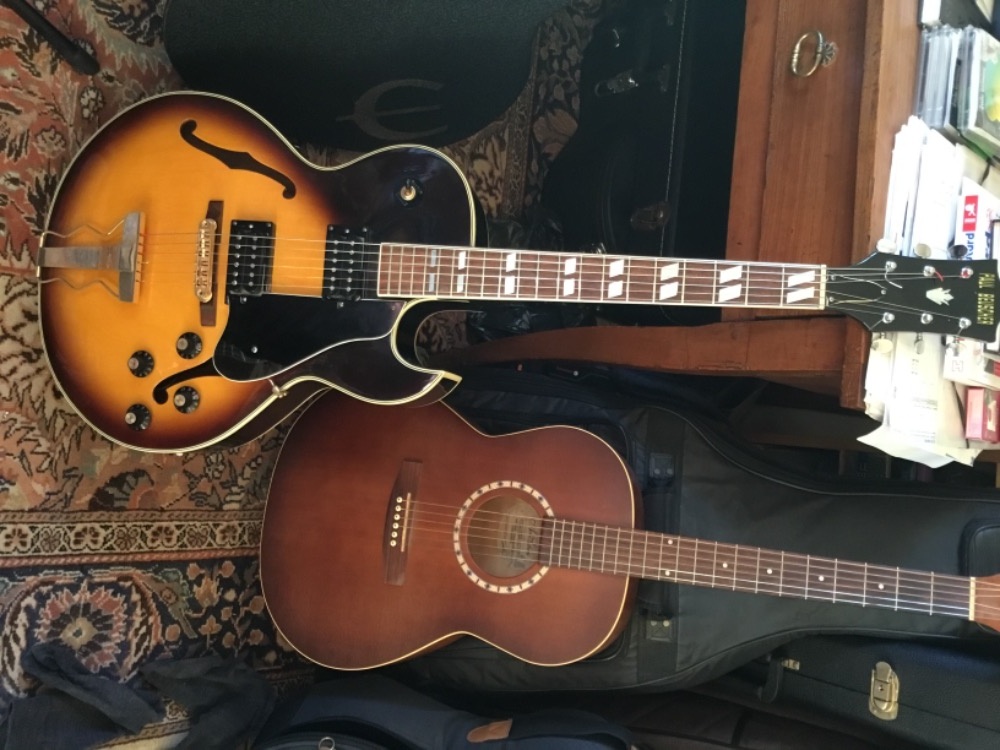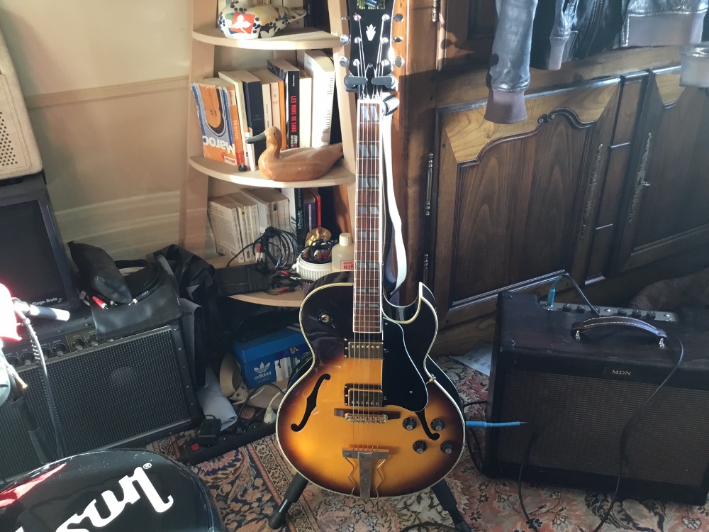 J’ai déniché une pure japonaise des années 70’, copie de ES 175, fabriqué dans les usines japonaises d’Ibanez de la grande époquePré-lawsuit du procès de Gibson, avec la tête en forme de moustache comme les Gibson