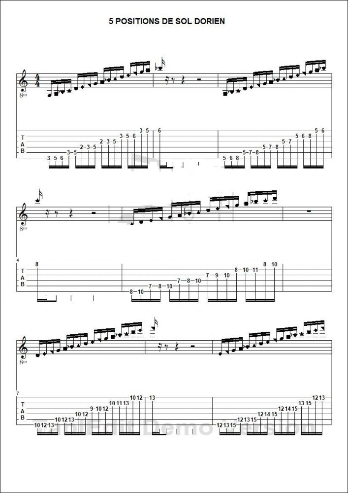 voici les cinq positions de sol dorien sur le manche de la guitare