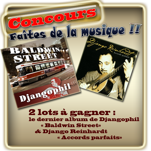 Tirage au sort le Dimanche 7 Juillet pour désigner les 2 participants qui remporteront les lots : Le dernier album du groupe DJANGOPHIL : BALDWIN STREET ( mélange de reprises et de compositions ) et Accords parfaits, regroupant les meilleurs ( et plus connus ) titre de notre moustachu manouche préféré !