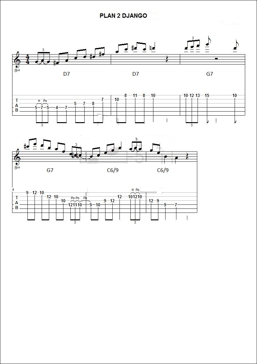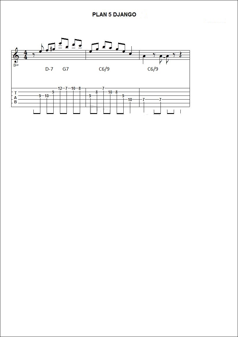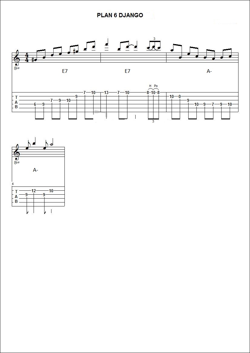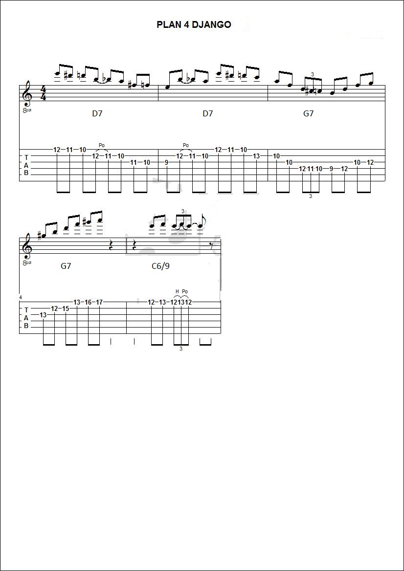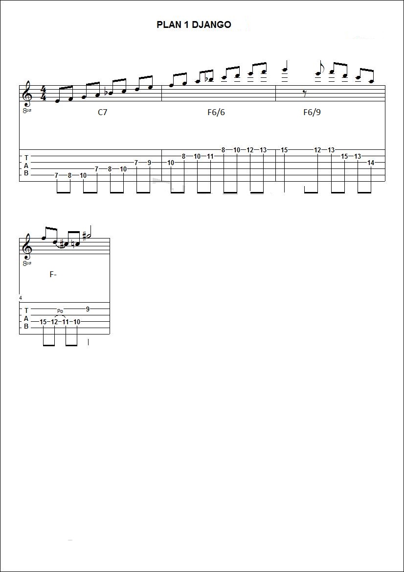 je vais poster des plans de Django repiqués sur differents morceaux afin d'essayer de comprendre un peu ses improvisations (utilisation de gammes,triade,arpeges,substitution,approches chromatiques.....).