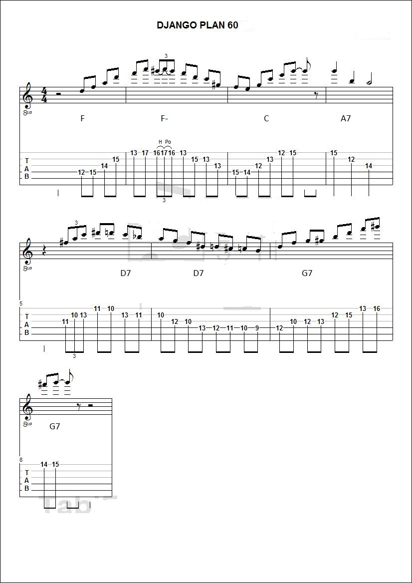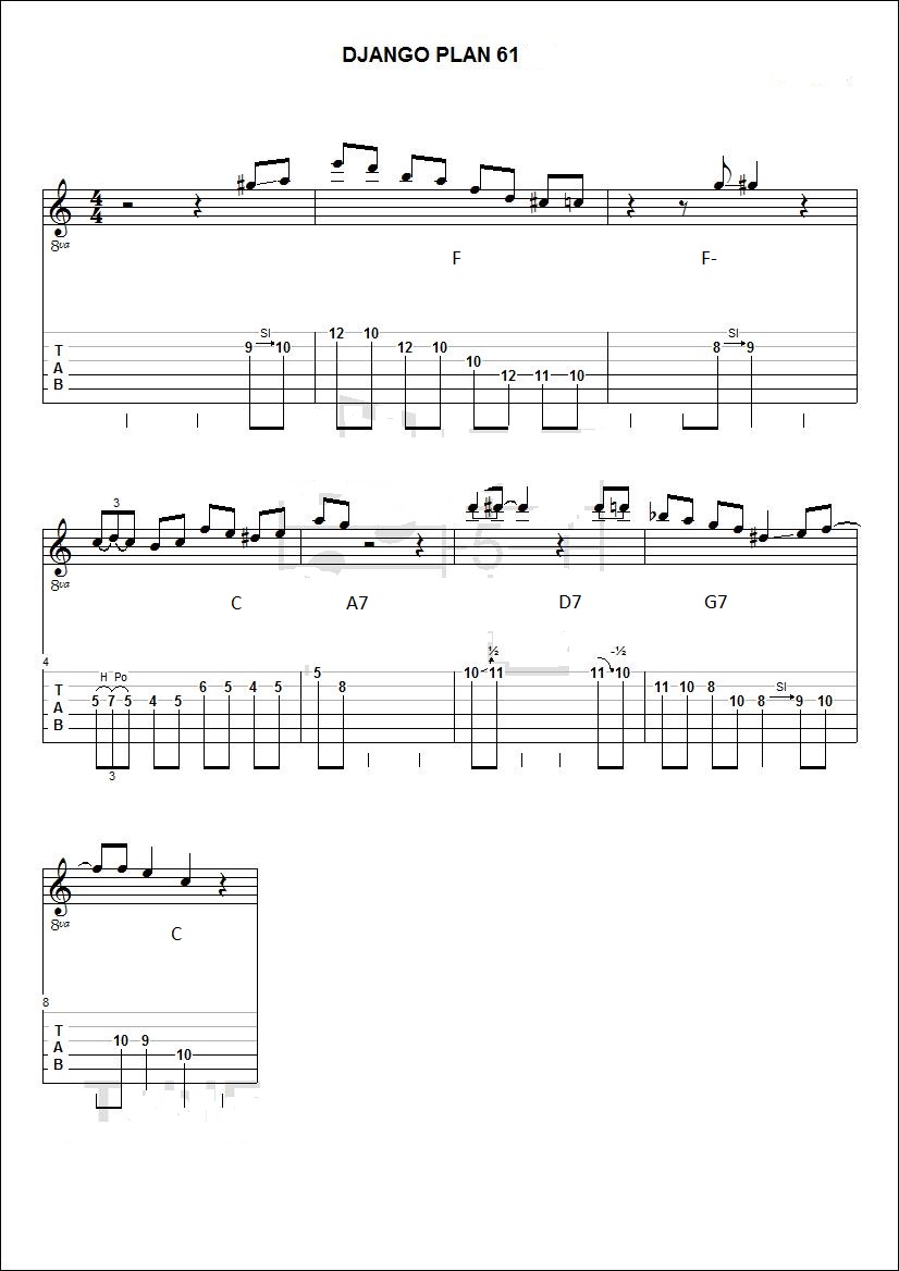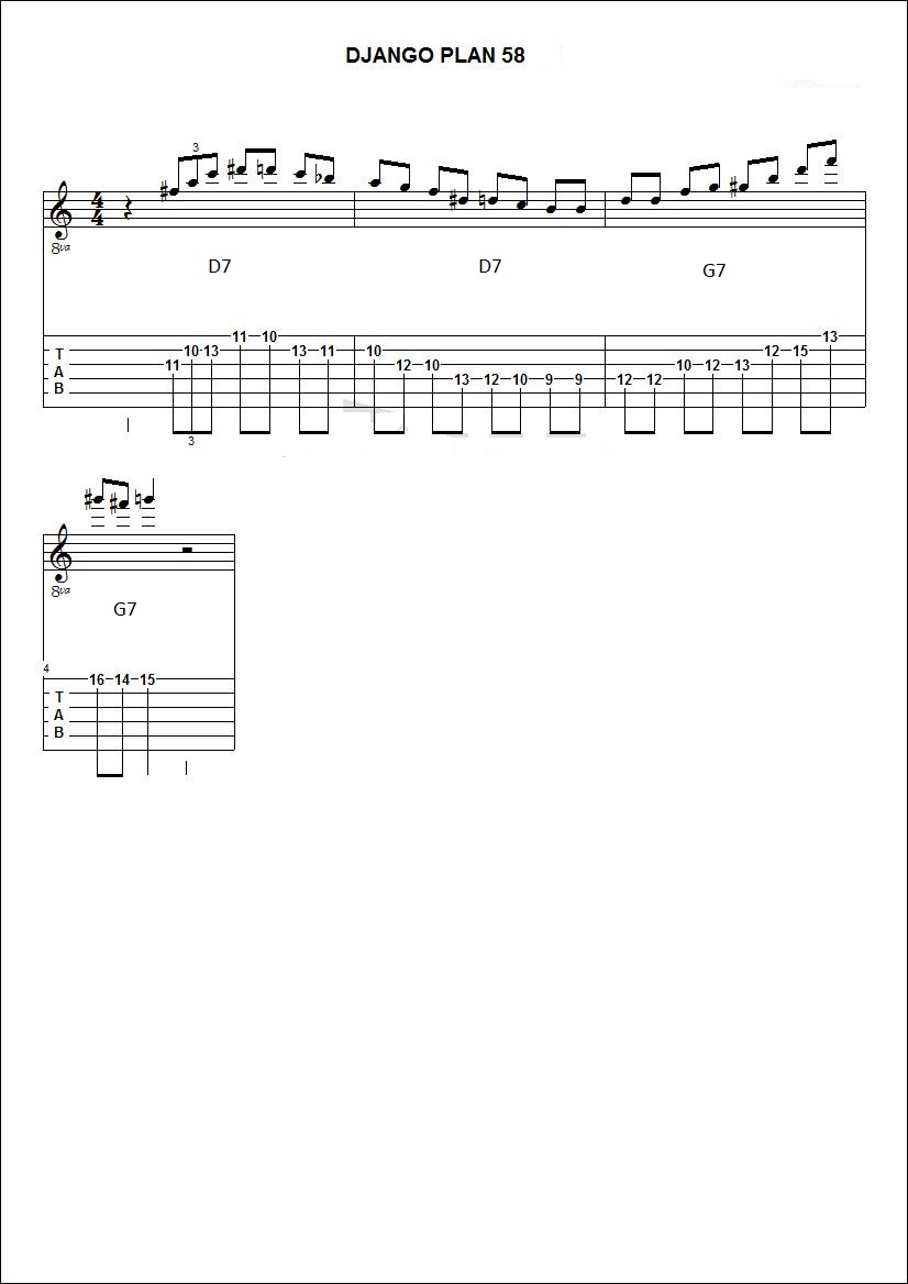 sur D7:arpege de F#dim7 puis gamme de Bb majeur (sur un accord de septieme issue de la tonalité mineure nous aurions joué la gamme de fa# mineur harmonique et bien la Django joue la gamme de Bb majeur. entre ces deux gammes une seule note change c'est le fa# qui devient fa .cette note est la 9# de D7)