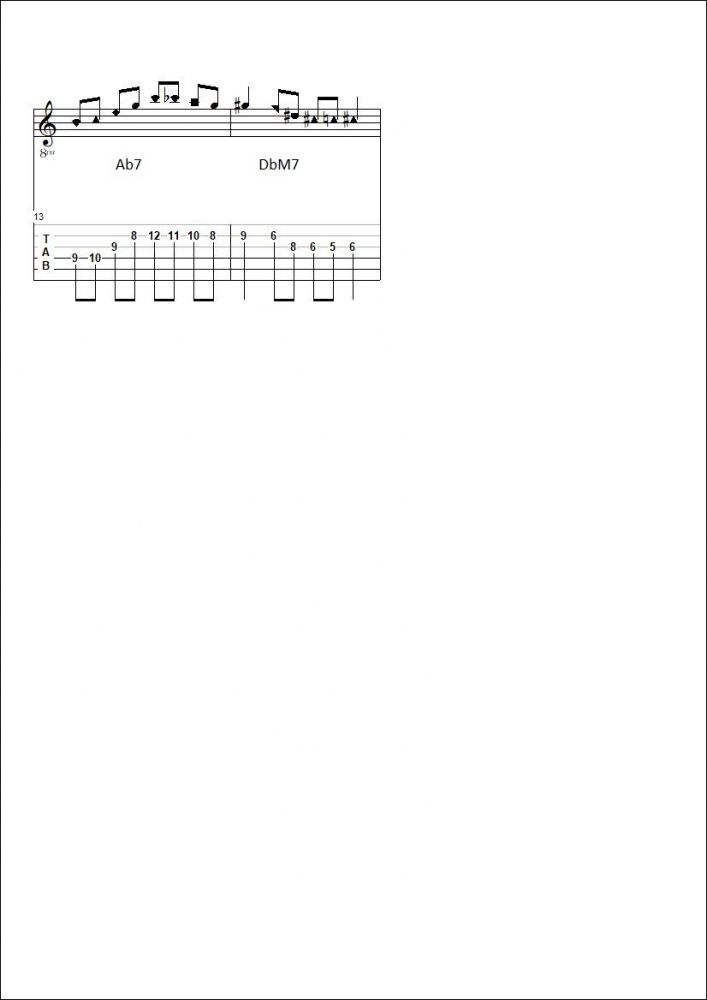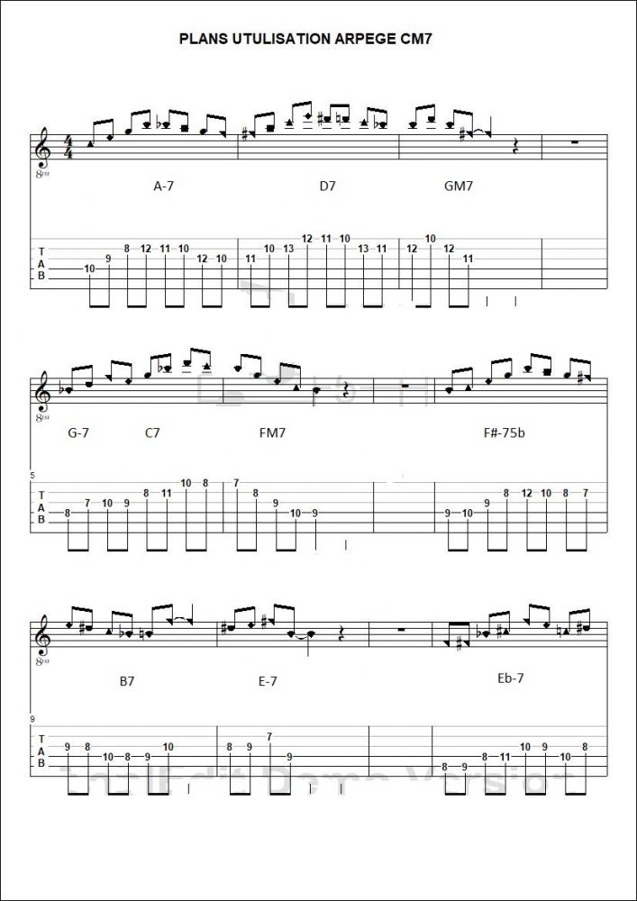 sur l'accord de A-7 on utilise un arpège de CM7,sur D7 un arpège de F#-75b et on arrive sur la tierce de GM7 (si) avec une triade de B-