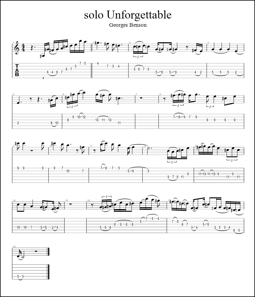 Voila la transcription du solo de Georges Benson sur Unforgettable, tiré de son dernier album de reprises " Tribute to Nat King Cole ".