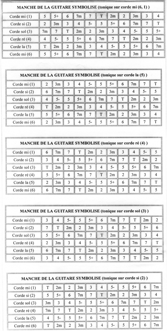 La série de tableaux qui suit représente le manche guitare, mais en donnant uniquement les degrés relatifs. Cela permet de construire simplement un accord ou une gamme sans en connaître toutes les notes. Il suffit de repérer l'emplacement de la tonique et connaître les degrés.